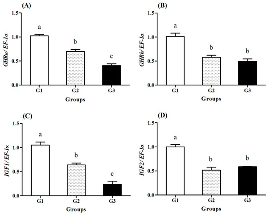 As is shown in Figure 4, subacute ammonia nitrogen stress significantly decreased the relative expression levels of growth-related genes in the muscles of the blunt snout bream. The relative expression levels of the GHRa, GHRb, IGF1, and IGF2 genes in the stress groups were significantly lower than those of the fish in the control group (p < 0.05).