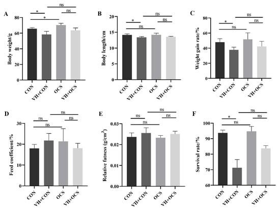 Growth performance of hybrid groupers in different treatments (a control group (CON), a group treated with V. harveyi (VH + CON), a group treated with oligochitosan (OCS), and a group treated with a combination of V. harveyi and oligochitosan (VH + OCS)). (A) Body weight; (B) Body length; (C) Weight gain rate; (D) Feed coefficient; (E) Relative fatness; (F) Survival rate. The asterisks indicate significant differences (*, p < 0.05 and ns, not significant) among different groups.