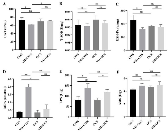 To assess the effects of Vibrio infection and the mitigating effect of oligochitosan on the enzyme activities in the midgut of hybrid groupers, we quantified the biochemical activities of CAT, T-SOD, GSH-Px, MDA, LPS, and AMS in different experimental groups (Figure 2). The activity of the antioxidant enzyme CAT significantly decreased in VH + CON compared to CON and significantly increased in VH + OCS compared to VH + CON. In addition, the activity of T-SOD significantly decreased in VH + CON compared to CON, while no significant changes were observed in the other groups. In contrast, the MDA levels significantly increased in VH + CON compared to CON and decreased in VH + OC compared to VH + CON. In terms of digestive enzyme activity, the LPS activity increased in VH + CON compared to CON and also showed an increase in VH + OCS compared to OCS. Remarkably, no significant differences were observed in T-SOD and AMS between the treatment groups.