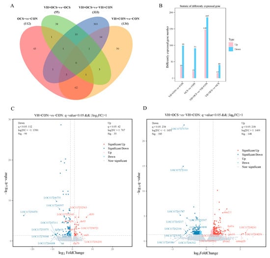 Overviews of DEGs identified in the intestines among different treatments. (A). Venn diagram of annotated DEGs between two different groups. (B) Number of differently expressed up-regulated and down-regulated genes. (C,D) Volcano plots of DEGs between VH + CON vs. CON (C) and VH + OCS vs. VH + CON (D).