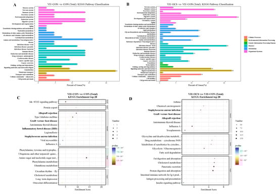 Pathway enrichments of all DEGs in the intestine of hybrid groupers. (A,B). KEGG classification in second level of the DEGs between VH + CON and CON (A) and VH + OCS and VH + CON (B). It shows enrichments of secondary KEGG terms in the background and differentially expressed genes. (C,D) The most enriched KEGG pathways in third level between VH + CON and CON (C) and VH + OCS and VH + CON (D).