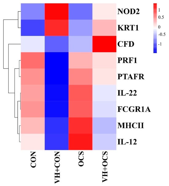The relative abundance of the DEGs co-occurring in the pathways, including allograft rejection, graft-versus-host disease, inflammatory bowel disease, and Staphylococcus aureus infection, is presented in the heatmap (Figure 5). In contrast to CON, the relative mRNA expression levels of several DEGs, including nucleotide-binding oligomerization domain 2 (NOD2), keratin-1 (KRT1), and complement factor D (CFD), significantly increased in VH + CON and decreased in VH + OCS compared to VH + CON. Unexpectedly, the relative mRNA expression levels of DEGs such as perforin 1 (PRF1), platelet-activating factor receptor gene (PTAFR), interleukin-22 (IL-22), Fc gamma receptor-1A (FCGR1A), major histocompatibility complex class II (MHCII), and interleukin-22 (IL-12) significantly decreased in VH + CON and increased in VH + OCS compared to VH + CON.