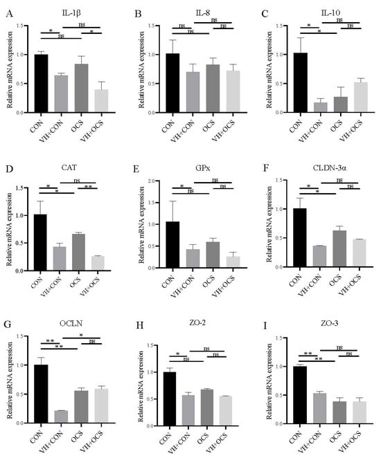 To evaluate the impact of V. harveyi infection on the immune system and the immunomodulatory effects of oligochitosan, we quantified the mRNA expression levels of key immune-related genes in the intestinal tissue of hybrid groupers by qRT-PCR (Figure 6). Compared to CON, VH + CON exhibited a significant downregulation in the mRNA expression of pro-inflammatory cytokines, such as IL-1β and IL-10; conversely, the relative expression of IL-10 significantly increased in VH + OCS compared to VH + CON (Figure 6A–C). Antioxidant-related genes, including CAT and GPx, significantly decreased in VH + CON compared to CON. However, the relative expression of CAT was significantly decreased in VH + OCS compared to VH + CON (Figure 6D,E). In terms of tight-junction proteins, the relative gene expression, including CLDN-3α, OCLN, ZO-2, and ZO-3, significantly decreased in VH + CON compared to CON. Furthermore, the relative expression of OCLN significantly increased in VH + OCS compared to VH + CON. However, the relative expression of CLDN-3α and ZO-3 significantly decreased in VH + OCS compared to VH + CON (Figure 6 F–I).
