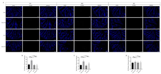 Apoptosis analyses in the midgut tissues of hybrid groupers. (A) TUNEL staining, showing apoptosis in red fluorescence. Scale bar, 50 μm. (B–D) Comparative analysis of fluorescence intensity within the foregut, midgut, and hindgut in various experimental treatments. The different symbols show significant differences (**, p < 0.01; *, p < 0.05; or ns, not significant).
