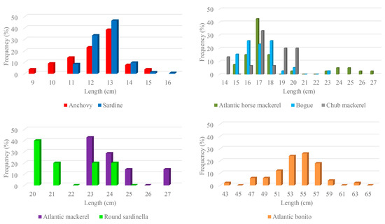 Length frequency distribution of the eight analysed fish species (anchovy, sardine, Atlantic horse mackerel, bogue, chub mackerel, Atlantic mackerel, round sardinella and Atlantic bonito) caught with commercial ‘Srdelara’ purse seines in the Central Eastern Adriatic, November 2020 to March 2022.