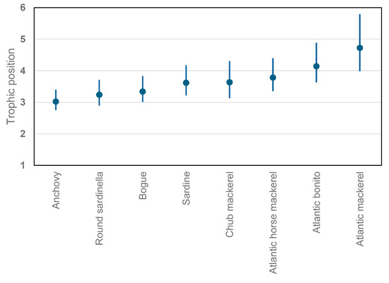 The TP of each investigated species was calculated based on the obtained stable isotope values. The TP values reported in the present study almost completely coincide with what has been reported for these species, whether they come from the Adriatic Sea [14,43,44] or the Mediterranean Sea [45,46,47]. Namely, the lowest and highest TPs were attributed to the anchovy and the Atlantic mackerel, respectively. Small differences in TP values may be due to variations in the sampled environments, as discussed by [14], or because the present study included fish specimens of different body lengths. This observation is in line with the understanding that many researchers have highlighted, where marine pelagic habitats show a strong relationship between trophic levels and body size. This relationship is believed to play a significant role in shaping the food web dynamics of marine ecosystems [48,49,50,51,52].