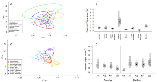 Variations in carbon (δ13C), nitrogen (δ15N), the standard ellipse area (SEA) and isotopic niche overlap for (A) the eight analysed fish species during the colder period of year (November–April) and (C) between the sardine and the anchovy (standard ellipse area corrected for a small sample size [SEAc]) throughout the entire investigated period. Posterior distribution of the SEAb for eight analysed pelagic fish species (B) and seasonally sampled sardine and the anchovy (D). SEA—Standard Ellipse Area, SEAb—Bayesian Standard Ellipse. Black dots represent modes; the shaded boxes represent the 50%, 75% and 95% credible intervals (from dark grey to light grey).