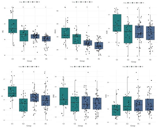 Initially, no significant differences were observed between different groups in terms of the average body length and weight. Over the six-week experiment, the control group C1 showed a significantly higher condition index after four (K4) and six (K6) weeks. Although this group had the highest values when comparing the last two measurements (K6), group F1 showed a significantly higher condition index (K6) compared to the control group C2 at that interval (Supplementary Table S1).
