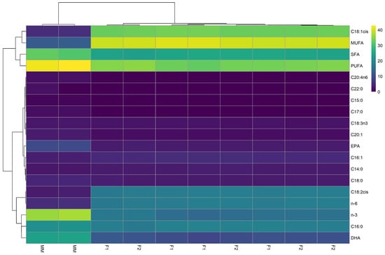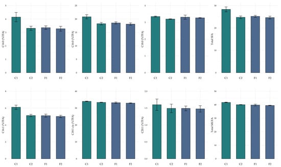 The profile of fatty acids was dominated by monounsaturated fatty acids (39.44–41.7%), followed by polyunsaturated fatty acids (28.2–34.35%) and saturated fatty acids (24.66–28.33%). An exception was noted for the fatty acid groups analyzed for gilthead seabream fed with commercial feed (C1), where the PUFA content (28.2%) was lower and the SFA content (28.33%) was higher than the trends described in the other feeding groups (C2–F2) (Supplementary Table S7, Figure 4 and Figure 5).