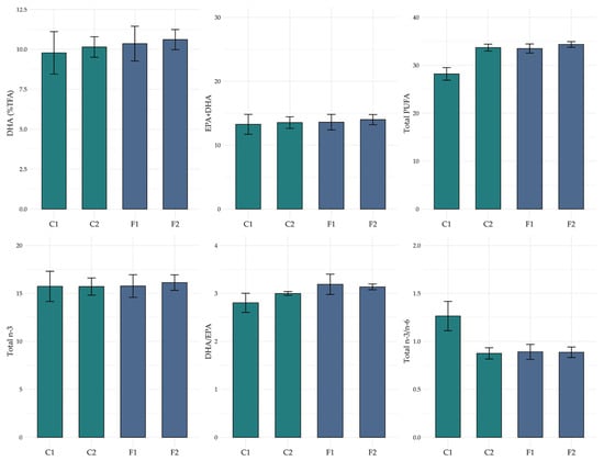 Polyunsaturated fatty acid (PUFA) profiles (mean ± SD) expressed as the % of total fatty acids (TFAs) of the dorsal muscle of gilthead seabream fed with different feed formulations (C1, C2, F1, F2) at the end of the experiment (6 weeks). Different letters indicate significant differences among different groups (p < 0.05).
