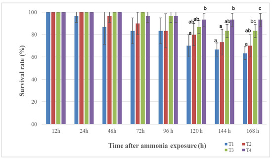 Survival rate of tilapia fed different levels of Cabanin® after 168 h of ammonia exposure. Results are mean ± standard deviation (n = 3). The column with different letters represents significant differences (p < 0.05). T1: control low; T2: control high; T3: 40% Cabanin® replacement; T4: 80% Cabanin® replacement.