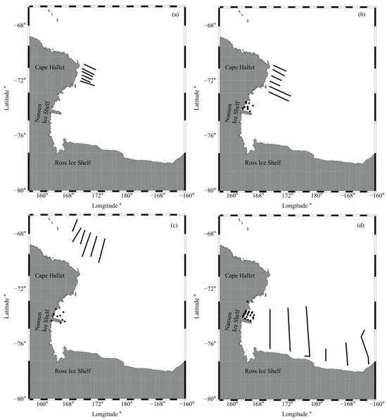 Location map of the acoustic survey transects in the Ross Sea. (a) February 2018, (b) December 2018, (c) March 2020, and (d) December 2020. The black dots represent icons generated for drawing lines, while the lines symbolize acoustic survey transects.