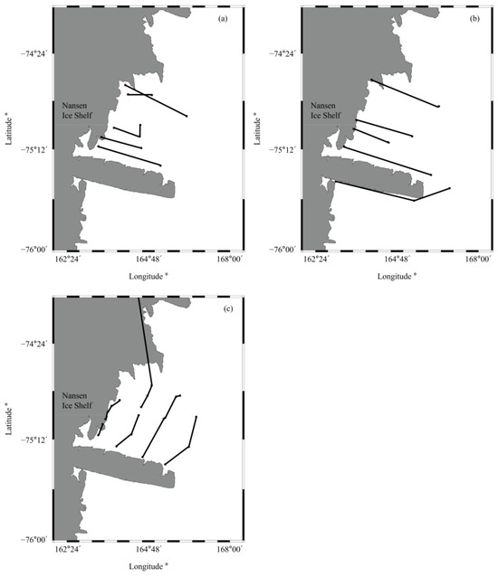 Location map of the acoustic survey transects in polynya waters. (a) December 2018, (b) March 2020, and (c) December 2020.