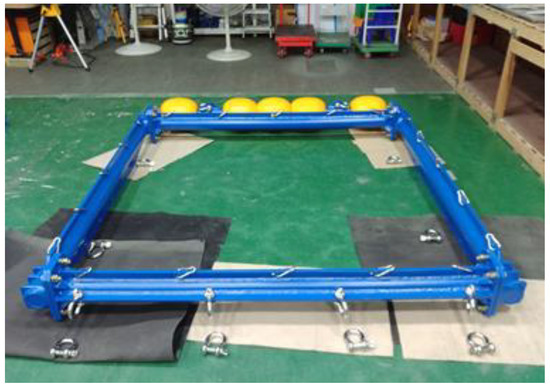 It was necessary to determine the length and weight of the target fish species to evaluate species density via hydroacoustics. Therefore, quantitative fishing gear to collect the target fish species in the survey area was required. Since the shape of the net structure changes depending on the speed of the survey vessel, a small midwater trawl with a frame trawl of 2 m × 2 m was used. The frame was made of stainless steel with a diameter of 100 mm. For stable fishing gear deployment, five buoys were installed on the top for buoyancy, and four 100 kg weights were attached to the lower bar for reinforcing weight and stability (Figure 3). The net was manufactured in duplicate by using double-walled nets of approximately 7 m; the outer net protected the inner net from breakage. The mesh sizes of the inner and outer nets were 5 and 10 mm, respectively. The square frame net was used as fishing gear to collect fish larvae and specimens.