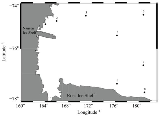Collections via the frame trawl were carried out on the Ross Sea ice shelf, located offshore of the continental shelf in relatively shallow water with a depth ranging from 600 to 700 m [14]. A total of eight voyages were carried out between 7 and 16 December 2020 (Figure 4). While maintaining a vessel speed of 2–3 knots, the net was towed for more than 30 min, and acoustic data were collected simultaneously.
