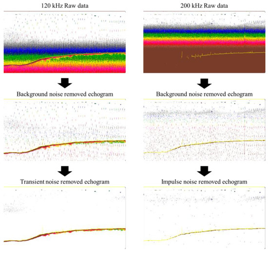 Examples of noise processing in the echogram. The intensity is indicated by the color, with red representing high intensity and blue indicating low intensity.