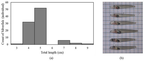 Antarctic silverfish can be classified into three age groups based on their length [3,8,9]. Specimens between 0.8 and 3 cm in length are classified as post-larvae, and those between 3 and 10 cm in length as juvenile fish. Specimens larger than 11 cm in length are classified as adult fish. Juvenile Antarctic silverfish is highly abundant in Antarctic waters, accounting for 98% of the total plankton [10].