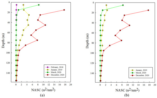 The vertical distribution of the NASC values for Antarctic silverfish in the nearshore waters of the Antarctic Ross Sea is shown in Figure 8. The detection range at a frequency of 200 kHz was considered in 10 m intervals from a depth of 15 m to a depth of 155 m. The vertical distribution in February 2018 showed low NASC values in all water layers. The vertical distribution in December 2018 showed the highest value of 4.29 m2/nm2 at a depth of 25 m. The NASC values in March 2020 were highest at the surface with 8.3 m2/nm2, but NASC values lowered with increasing depth. The values in December 2020 were highest at the surface, and higher values were found at depths of 50 and 60 m. Most high NASC values were found within 20 m. The vertical distribution of NASC values of the Antarctic silverfish in the polynya area in the Antarctic Ross Sea was as follows: strong NASC values were found at the surface in December 2018; in March 2020, NASC values tended to increase with depth. NASC values in December 2020 were found to be high at a depth of 20 m and higher at depths of 50 and 80 m. Both nearshore and polynya waters showed a strong distribution at the surface.