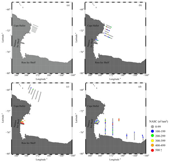 Horizontal distribution of Antarctic silverfish NASC values in the Ross Sea. (a) February 2018, (b) December 2018, (c) March 2020, and (d) December 2020.