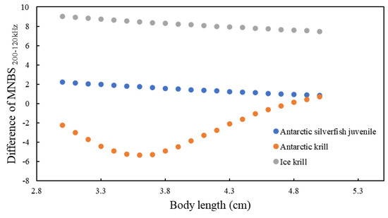 By comparing the MVBS (200–120 kHz) difference in the range 3–5 cm, where the lengths overlapped, the difference of MVBS (200–120 kHz) between Antarctic silverfish and Antarctic krill (E. superba) became similar as the lengths increased (Figure 11). Therefore, future studies should be conducted on the acoustic backscatter strength of Antarctic silverfish, Antarctic krill, and ice krill to develop algorithms that can more clearly distinguish the three species. Additionally, krill are characterized by large-scale clustering, whereas juvenile Antarctic silverfish tend to be more dispersed [20,21]. Therefore, studies of their clustering or dispersion patterns may also be helpful in distinguishing them.