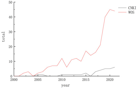 Since 2002, there has been an overall increase in the number of relevant papers published in journals (Figure 2). Over the course of the previous half-decade, there was a notable surge in the quantity of articles pertaining to WOS, which corresponded with an increase in research interest. Since 2017, the number of articles published in core journals gradually increased, and many domestic scientific research institutions focused on related research based on the remote sensing extraction of aquaculture areas.