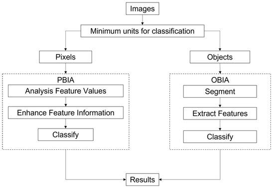 The PBIA classification method has been widely utilized in the automated extraction of remote sensing pictures, representing one of the earlier approaches in this field [45], which facilitates the analysis of spectral feature values among pixels and enhances feature information to optimize the extraction of target characteristics. The OBIA classification method takes into account several factors such as the target’s structure and texture, and the association between neighboring image elements, which involves the transformation of individual image elements into image objects, incorporating spatial information about these objects as well as their semantic characteristics [46]. The detailed classification processes are represented in Figure 3.