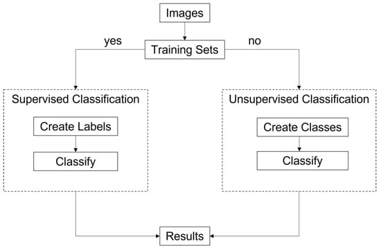 Supervised and unsupervised classifications of remote sensing image are derived from the domain of machine learning, and the flowcharts of these two methods are shown in Figure 4. Supervised classification employed labeled training examples to classify remote sensing data. The process is characterized by a high level of automation, encompassing the delineation of information categories, the assessment of their spectral distinctiveness, the identification of suitable classification algorithms, and the subsequent application of these algorithms for data categorization. However, the use of this approach necessitates a substantial amount of precisely annotated training samples, a process that can be both time-consuming and costly to obtain. For example, Zhong et al. [52] effectively used an integration-enhanced gradient descent (IEGD) technique based on supervised classification to extract feature information from port aquaculture areas.