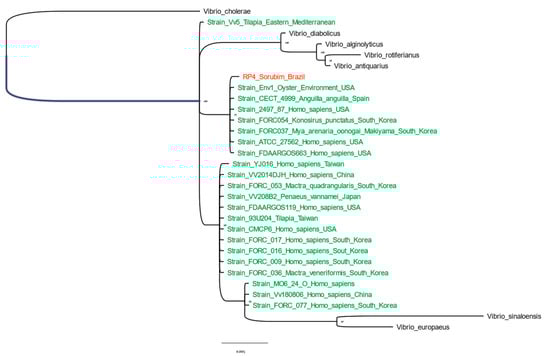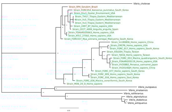 Phylogeny of V. vulnificus RP4 isolate from Pseudoplatystoma sp. (taxa in red) by 16S rRNA. Phylogenetic tree obtained by Bayesian analysis of 22 V. vulnificus (taxa in green), 7 Vibrio sp. (taxa in black), and with Vibrio cholerae as the root. All 16S rRNA gene sequences were obtained from NCBI. Prob node values are shown as a percent (%).