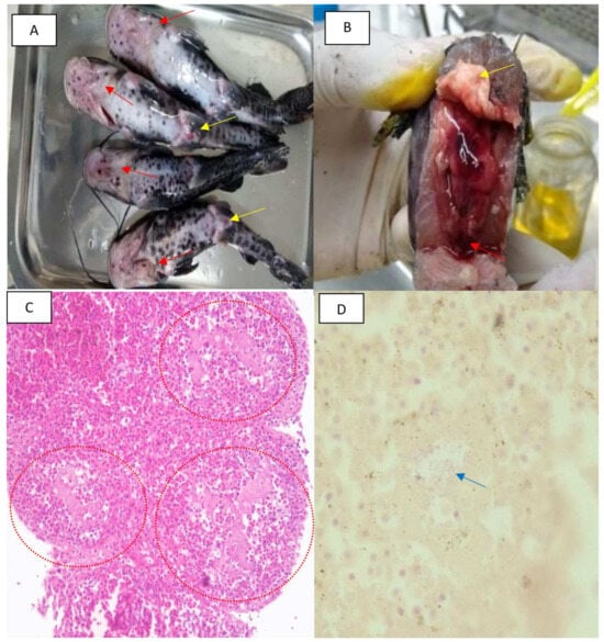 Pathological signs in fish subjected to experimental challenge via intracelomic injection of V. vulnificus RP4 isolate (107 CFU fish−1): (A), External lesions as reddish skin (red arrows) and swollen anus (yellow arrows); (B), Internal lesions as reddish ascitic fluid (red arrow) and congested swim bladder (yellow arrow); (C), foci necrosis areas on spleen (red doted ellipses); (D), splenic vessel (blue arrow) with endothelial necrosis and presence of eosinophilic bacilli into the vessel lumen.