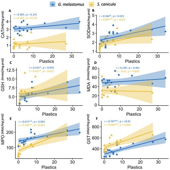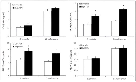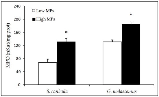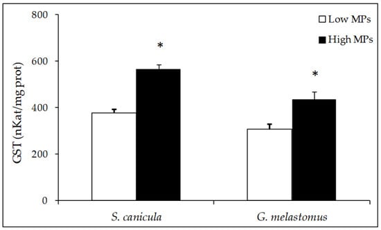 - Alomar, C.; Sureda, A.; Capó, X.; Guijarro, B.; Tejada, S.; Deudero, S. Microplastic Ingestion by Mullus surmuletus Linnaeus, 1758 Fish and Its Potential for Causing Oxidative Stress. Environ. Res. 2017, 159, 135–142. [Google Scholar] [CrossRef]