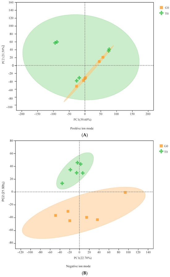 PCA score plot of serum samples from the G0 and T0 groups. Positive ion mode (A). Negative ion mode (B).