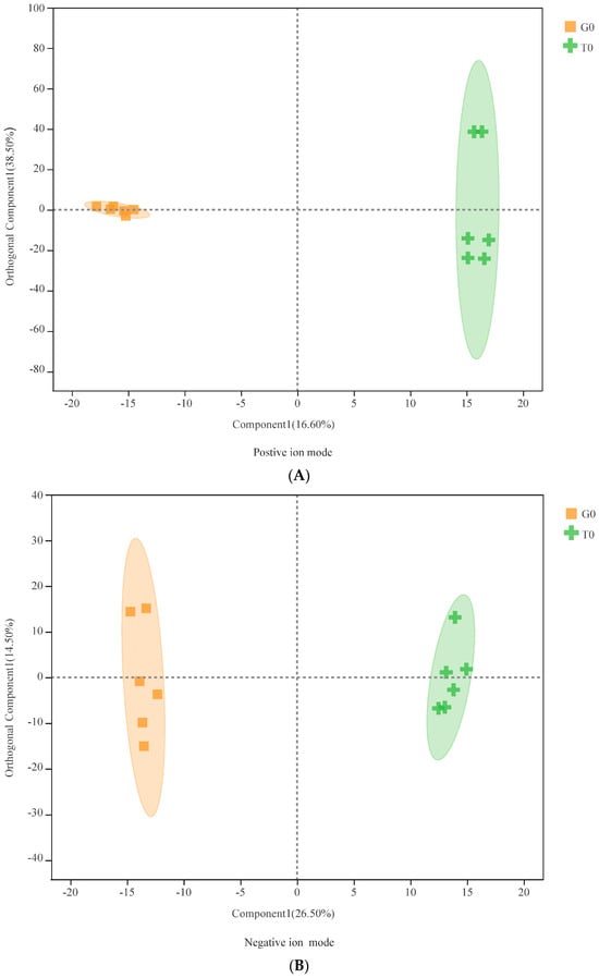Score scatter plot of OPLS-DA mode of serum samples from the G0 and T0 groups. Positive ion mode (A). Negative ion mode (B).