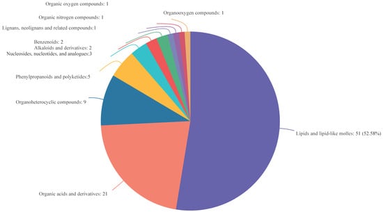DEMs were mainly lipid and lipid-like molecules, organic acids and their derivatives, organoheterocyclic compounds, phenylpropanoids, polyketides, nucleosides, nucleotides, and analogs (Figure 4).