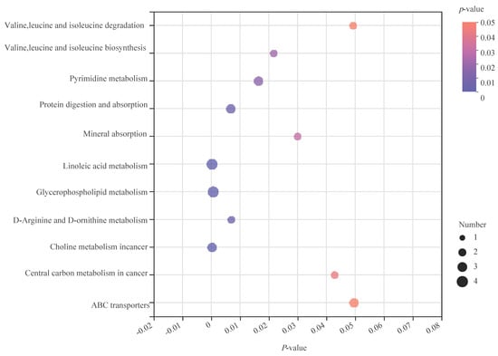 The KEGG pathway enrichment results revealed that DEMs were primarily enriched in 11 metabolic pathways, including glycerophospholipid metabolism, linoleic acid metabolism, choline metabolism in cancer, protein digestion and absorption, pyrimidine metabolism, mineral absorption, D-arginine and D-ornithine metabolism, and valine, leucine, and isoleucine degradation and biosynthesis (Figure 6).