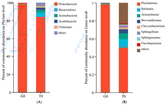Compared with the G0 group, the T0 group demonstrated an increase in intestinal microbe diversity, as well as an increase in the abundance of Ralstonia, Acinetobacter, Brevundimonas, Chryseobacterium, Sphingobium, Sphingomonas, and Flavobacterium and a decrease in the abundance of Plesiomonas at the genus level (Figure 7).