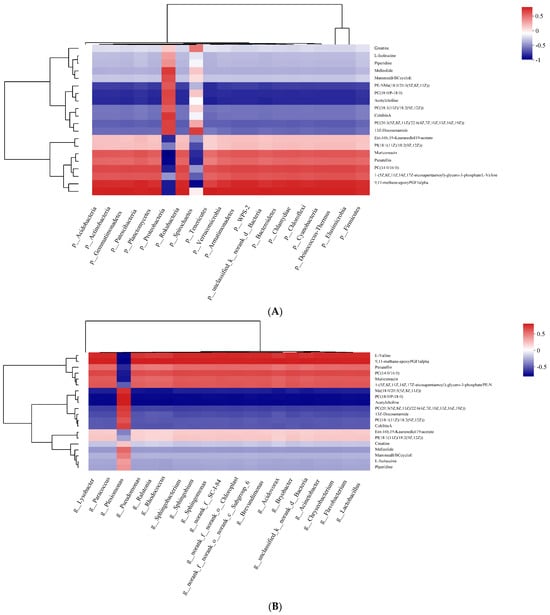 Correlation between intestinal metabolites and microflora at phylum (A) and genus (B) levels of T. fulvidraco.