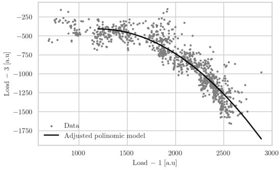 y-axis). It can be shown that below 1500 [a.u.] of sensor 1, the response of sensor 3 is nearly flat but, for higher loads, there is a quadratic relationship between them. Indeed, the data from both sensors are correlated (−0.86). They also represent a black curve with an adjusted second-degree polynomial.