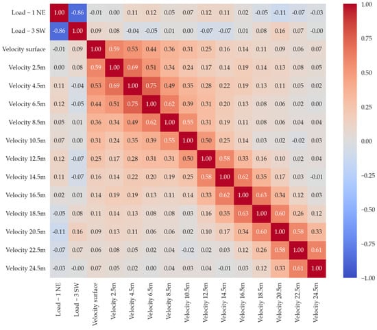 Figure 5) delineates the degree of linear relationship between sensor loads (Load 1—NE, Load 3—SW) and current velocities at varying depths (velocities at surface to velocities at 24.5 m). Notably, the contiguous current speed readings exhibit relatively high positive correlations, suggesting a pattern of coherent movement among adjacent water strata. This coherence likely reflects the influence of uniform hydrodynamic forces acting upon proximate depths. In contrast, the sensor loads (Load 1—NE, Load 3—SW) manifest a pronounced negative correlation, indicating an inverse relationship between the loading conditions detected by the two sensors. Such a negative correlation could be indicative of differing load responses to the same environmental stimuli or may reflect the positioning and orientation of the sensors relative to the current flow.