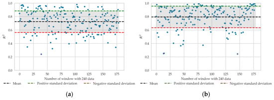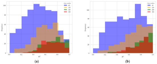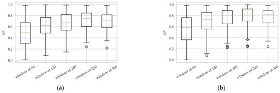 The optimal window discussed can be seen in the following figure, where it can be observed that as the size of the window increases, the distribution of R2 becomes larger. This holds true up to the optimal window (240), after which it slightly decreases at 300. The fact that this is the case for both load sensors, i.e., that both have the same trend, is due to their high inverse correlation.