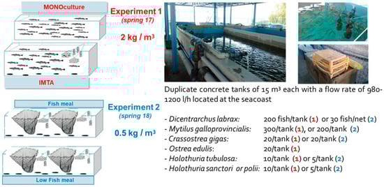 The conceptual approach of the proposed IMTA-like system is displayed in Figure 1, and a synoptic illustration of the experimental designs is presented in Figure 2.