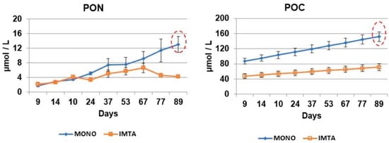 Temporal variation of particulate organic nitrogen (PON) and particulate organic carbon (POC) in monoculture and IMTA systems. Vertical lines indicate the SD; red circles indicate significant differences between the two rearing systems).