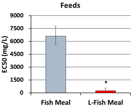 Toxicity of two commercially available fish feeds. Effective concentration (EC50) values of the 35% fish meal feed (FM group) and the 20% fish meal feed (L-Fish Meal, LFM group). Vertical bars indicate the SD. The asterisk indicates significant difference (p < 0.05).
