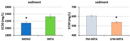 Toxicity of sediments. Effective concentration (EC50) values of sediments in the monoculture and IMTA systems and 35% fish meal (FM-IMTA) and 20% low fish meal (LFM-IMTA). Vertical bars indicate the SD. The asterisk indicates significant difference (p < 0.05).