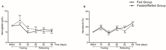 Hemoglobin concentrations (Figure 1)showed an increase after 30 days in the fasted group compared to the fed group (p = 0.011). However, there were no statistical differences for the fasted/refed group in all collection times compared to the basal group. Significant differences for hematocrit were found on experimental days 52 and 59, with the refed group showing a lower percentage compared to the control group.