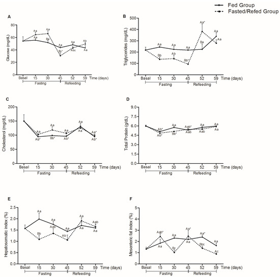 Glucose (mg/dL) (A), triglycerides (mg/dL) (B), cholesterol (mg/dL) (C), total protein (g/dL) (D), hepatosomatic index (%) (E), and mesenteric fat index (%) (F) in tambaqui juveniles subjected to fasting for 45 days and refed for 14 days or continuously fed during the 59 days of experiment. Capital letters indicate differences in the fasted/refed group and fed group within the same sampling period. Lowercase letters compare the fasted/refed group or fed group throughout the sampling period. Asterisks indicate differences between each group (fasted/refed and fed groups) with basal. Values are expressed as mean ± standard error mean (SEM). All comparisons were statistically different at p < 0.05.