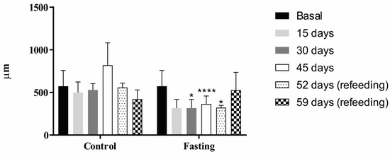 Regarding the length of intestinal villi (Figure 4), there was a decrease after 30 (p = 0.022) and 45 days (p < 0.0001) of fasting and 7 days of refeeding (52 days) (p = 0.040) compared to the fed group, but there were no significant differences present in the other collection times.