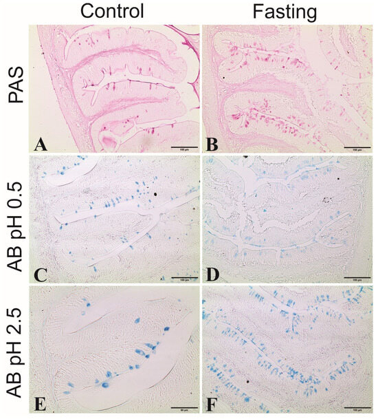 The morphological changes in the intestinal villi due to prolonged fasting were not accompanied by histochemical changes, as positive stainings for PAS, AB pH 0.5, and AB pH 2.5 were observed in the goblet cells of the intestines of both fasting and fed groups. These colors are related to the presence of glycogen, neutral glycoproteins and sialomucins (PAS), sulfated glycoconjugates (AB pH 0.5), carboxylate acids, and sulfated glycoconjugates, including sialomucins (AB pH 2.5), which are mucosubstances involved in processes such as lubrication, physical protection against pathogen invasion, and changes in the viscosity of the intestinal mucosa [56,57].
