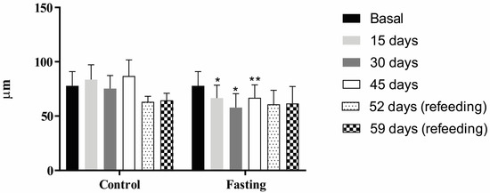 Muscle fiber thickness (in micrometers, µm) of tambaqui juveniles submitted to fasting for 45 days and refed for 14 days or continuously fed for 59 days of the experiment. The asterisks represent p < 0.05 (*) and p < 0.01 (**).