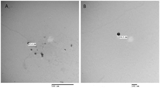 Transmission electron photomicrographs of the polystyrene nanoplastics. (A). Direct magnification 48,000×. (B). Direct magnification 58,000×.