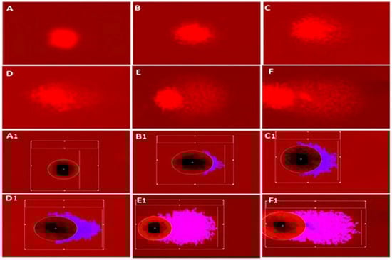 Assessment of different degrees of DNA damage induced by polystyrene nanoplastics using CASP software (CASP-version 1.2.3b) shows different degrees of DNA migration. (A,A1): intact nucleus (no DNA damage). (B,B1): mild DNA damage. (C,C1): moderate degree of DNA damage. (D,D1): severe DNA damage. (E,E1,F,F1): extensive DNA damage.
